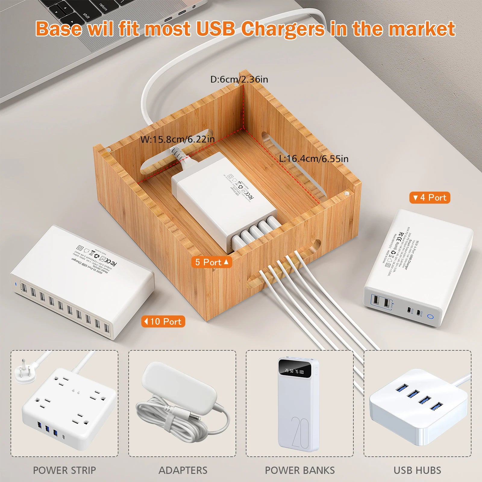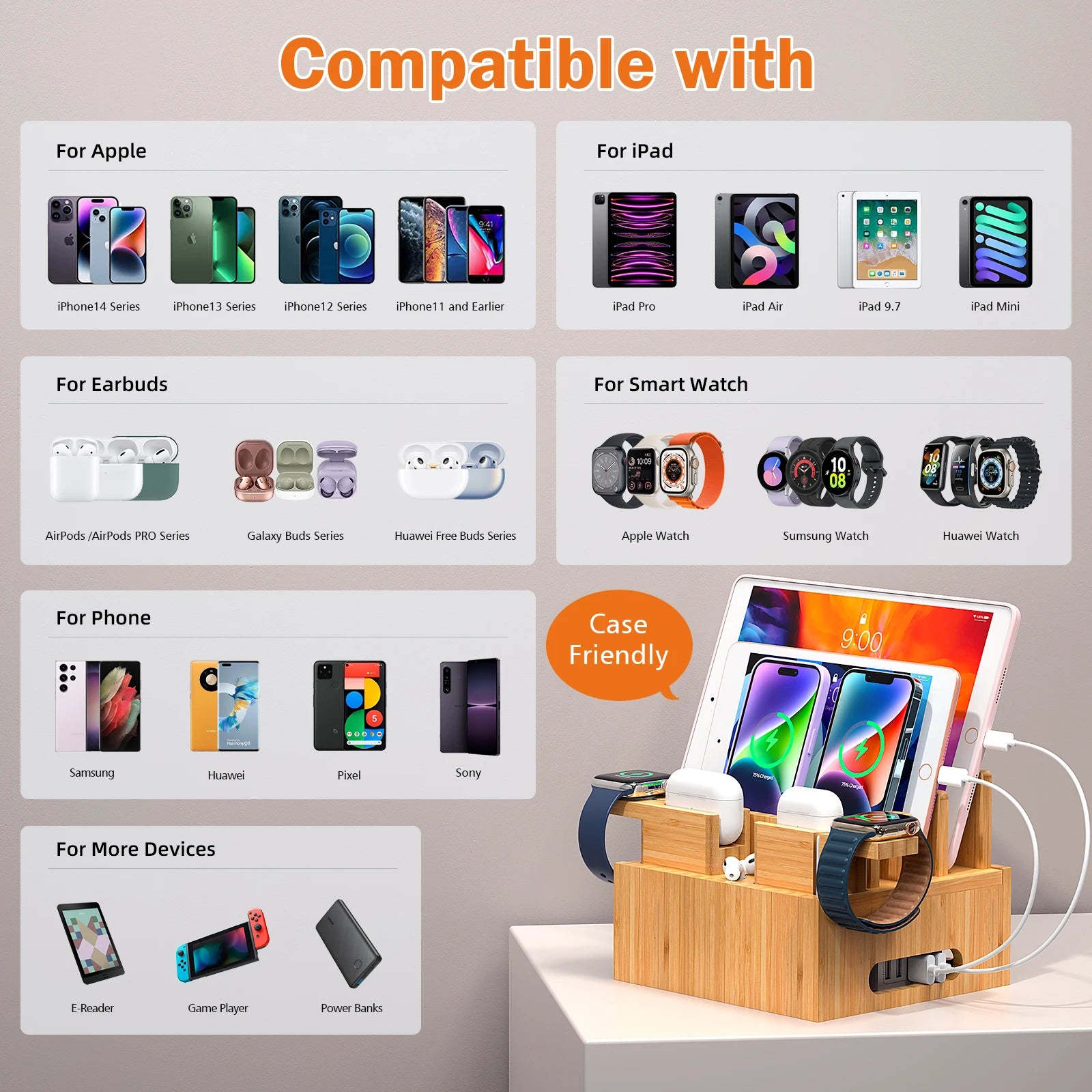 Hold styr på dine enheder og oplad dem alle ét sted – denne elegante bambus lade- og organizer station gør det nemt at oplade telefoner, tablets og trådløse høretelefoner samtidig. Perfekt til kontor, stue eller natbord.