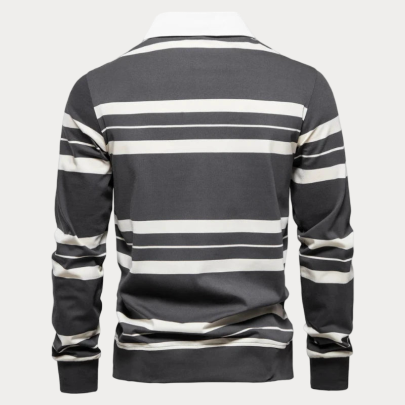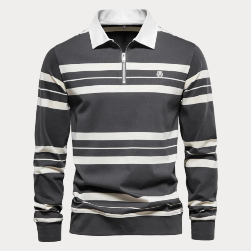 Giv dit hverdagslook et elegant og moderne touch med denne stribede jumper med krave. Det dristige stribede mønster og den sofistikerede lynlås giver en perfekt kombination af stil og komfort, ideel til afslappede udflugter eller endda semi-formelle lejligheder. Gør hver dag til en stilfuld oplevelse!