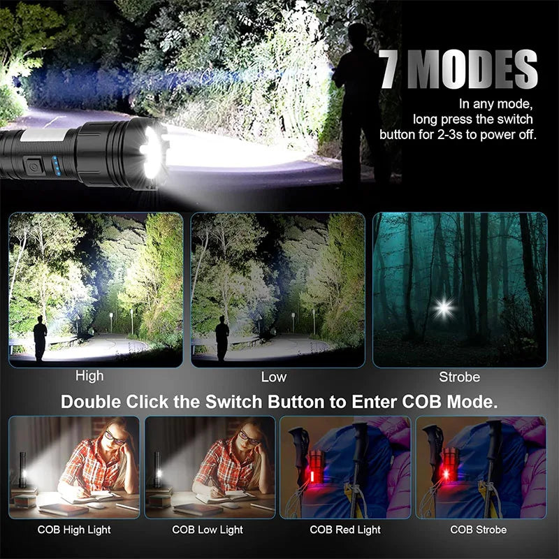 7 lysindstillinger – høj, lav, strobe, COB hvid (høj/lav), COB rød & rød strobe