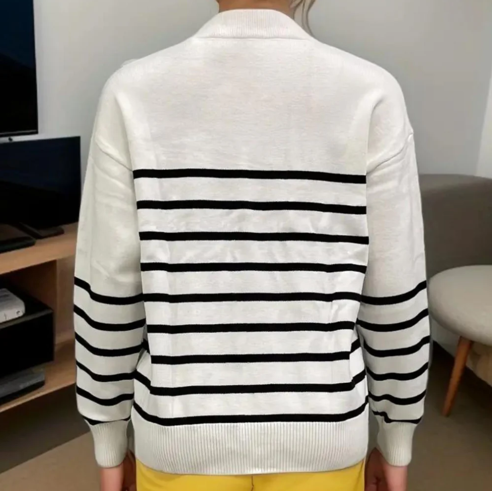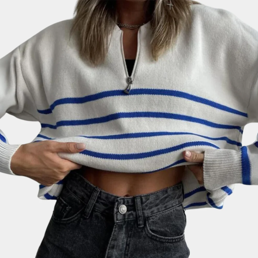 Halina-jumperen med lynlås til kvinder er det perfekte valg til alle, der ønsker moderne komfort og afslappet elegance. Det stribede look skaber et friskt, stilfuldt udtryk, mens den praktiske lynlås giver en ekstra detalje. Uanset om det er til fritidstøj eller et afslappet kontorlook, er denne trøje alsidig og kan nemt integreres i ethvert outfit.