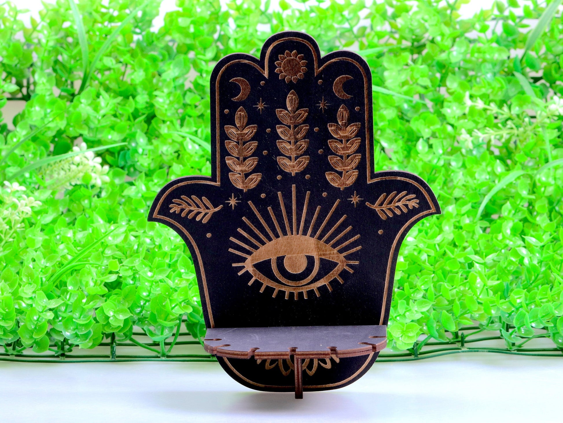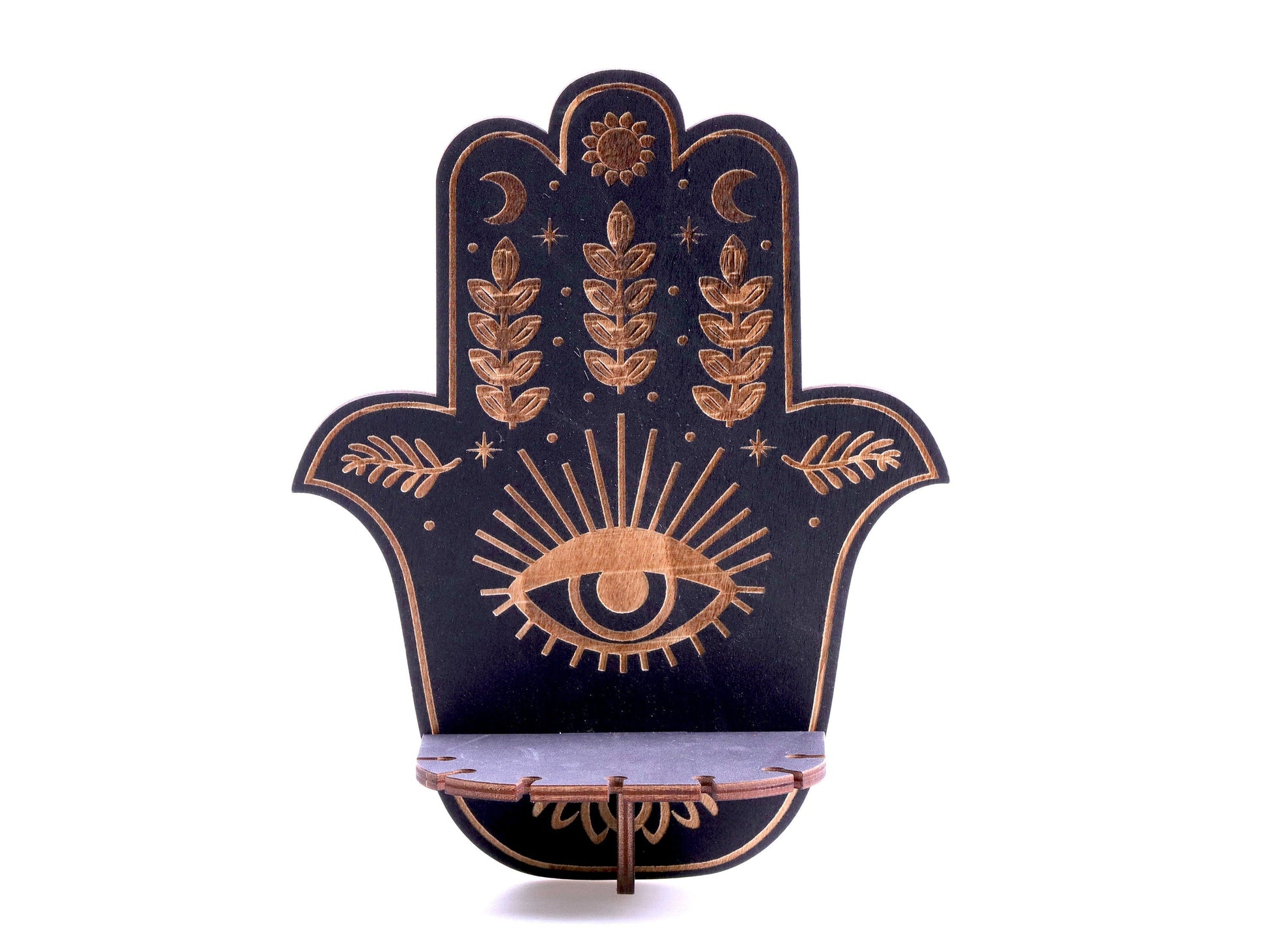 Hamsa-håndhylden er ikke kun ideel til krystaller og olier, men også perfekt til andre dekorationer og små skatte, som du gerne vil vise frem. Den hjælper med at undgå rod og beriger dit rum med positiv energi på samme tid.