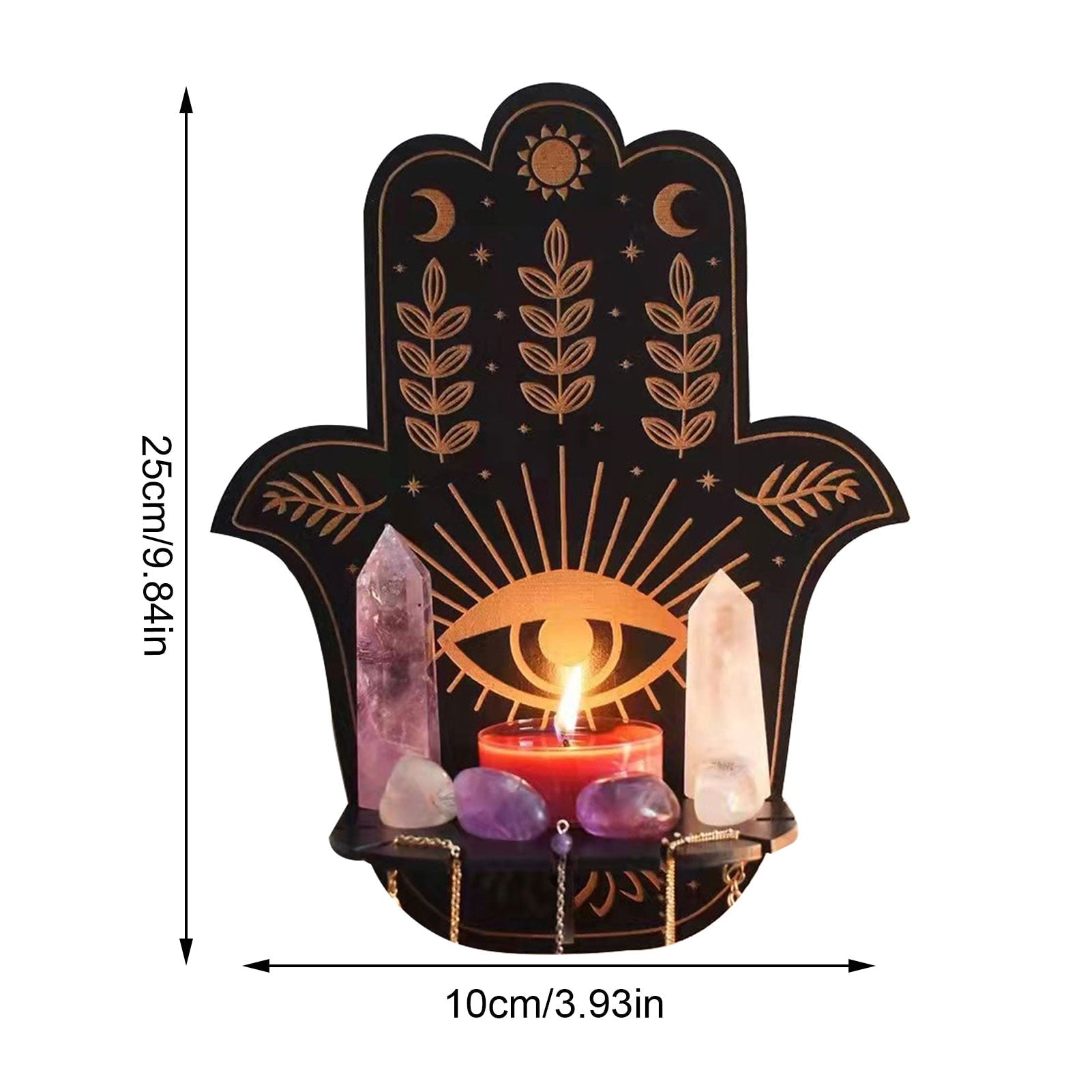 Med Hamsa-håndhylden kan du udstille dine krystaller med stil og slippe din kreativitet løs på samme tid. Hylden har plads nok til en række forskellige krystaller og æteriske olier, så du kan skabe en harmonisk atmosfære i dit rum.