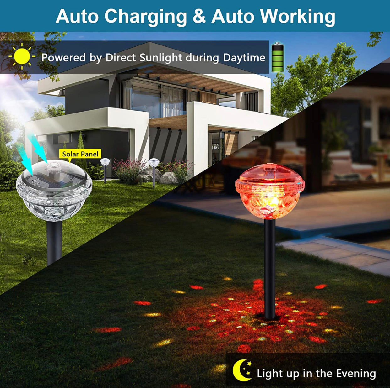 Det store solpanel i kombination med det genopladelige 600 mAh NIMH-batteri sikrer effektiv opladning fra sollys og muliggør en lang lysvarighed om natten - uden elomkostninger!