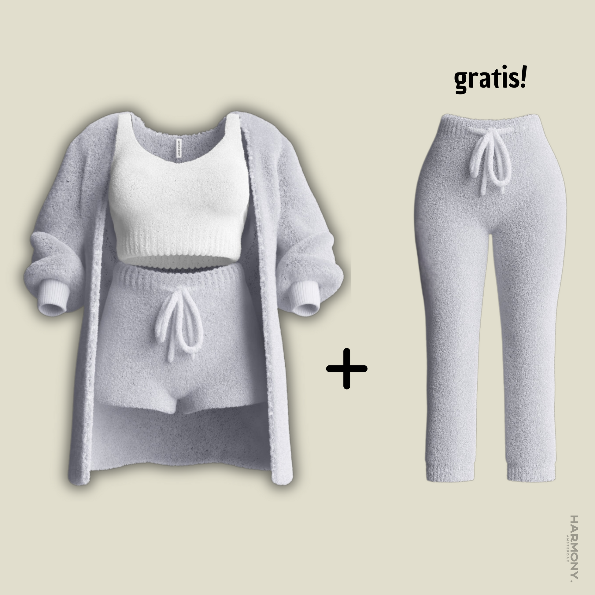 Genopdag komfort og stil med LuxLounge premium loungewear-sættet. Uanset om det er et 3-delt sæt med V-hals crop top, højtaljede shorts og åben frakke eller et 4-delt sæt med ekstra viddebukser - dette sæt tilbyder alt til luksuriøse øjeblikke inden for dine egne fire vægge. Den bløde bouclé-lignende tekstur sikrer en uovertruffen følelse og gør din afslapningstid til en sand fornøjelse.
