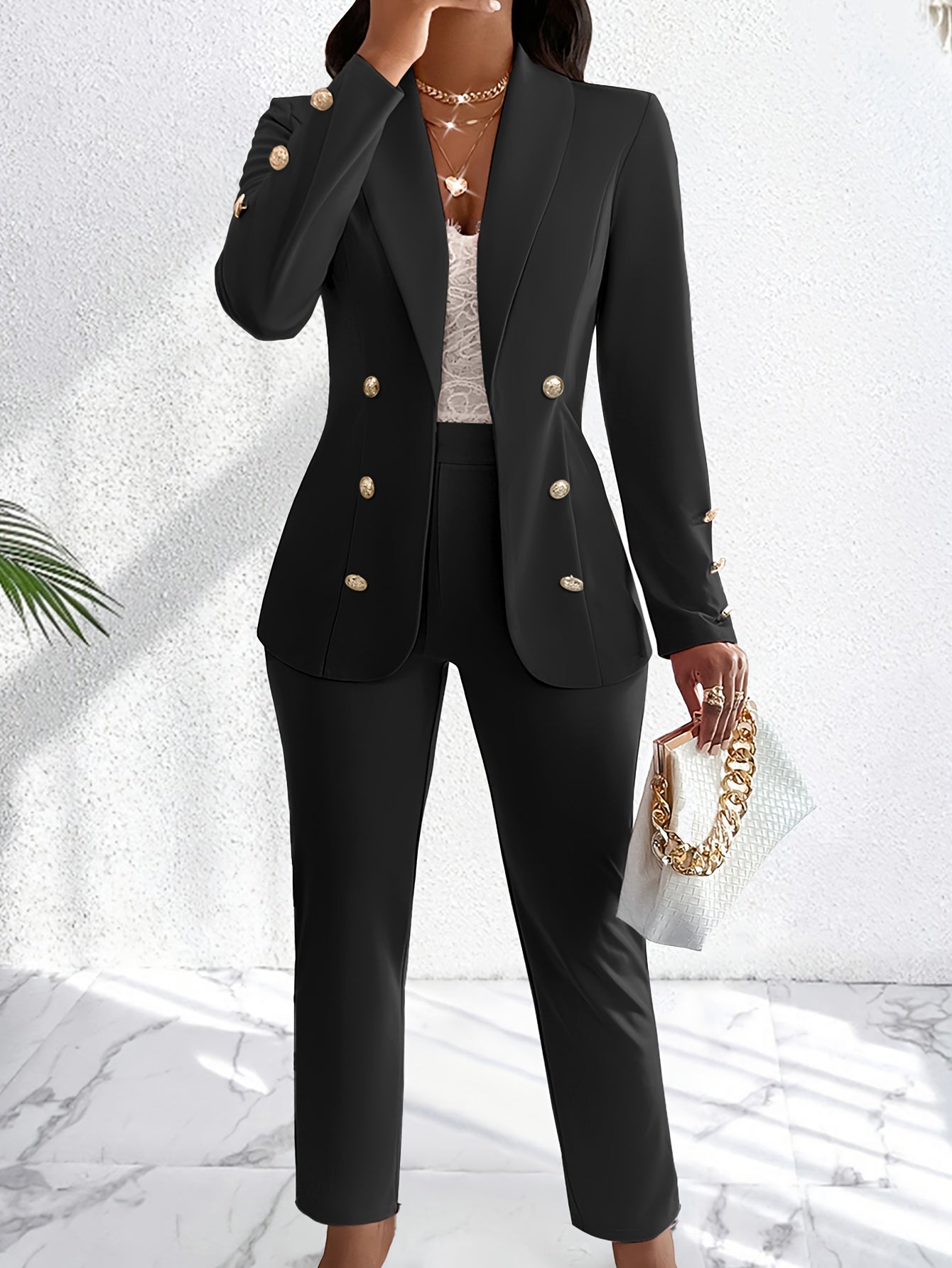 Er du klar til at tage dit look til næste niveau? Med Olivias blazer- og buksesæt med guldknapper vil du føle dig elegant og selvsikker hver gang. Uanset om du skal til et vigtigt møde eller en festlig begivenhed, vil dette sæt med garanti vække opsigt. Det luksuriøse design og den perfekte pasform smigrer din krop og får dig til at se både smuk og kraftfuld ud.