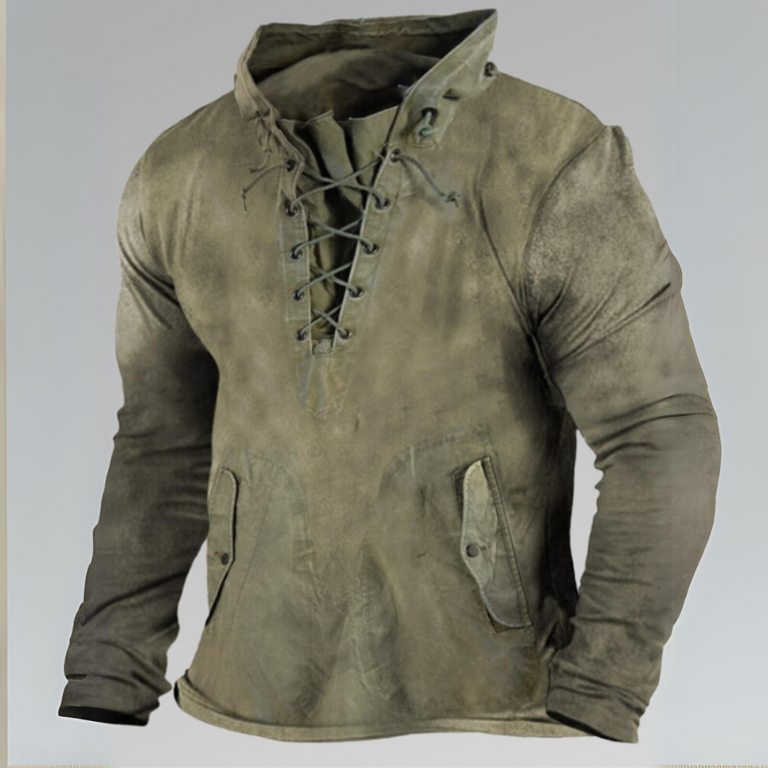 Denne varme herretrøje kombinerer tidligere tiders charme med nutidens robusthed og modernitet. Med lange ærmer og en unik snørelukning foran er denne trøje et ægte blikfang - ideel til udendørs eventyr eller afslappede udflugter på køligere dage. Lad dig inspirere af alsidigheden og stilen i dette must-have.