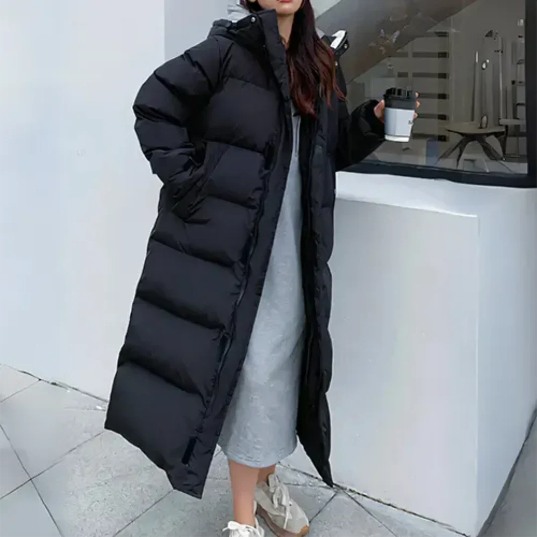 WarmElegance puffer-vinterdunjakken til kvinder kombinerer elegance og førsteklasses varme i et unikt design. Med sit dunfyld af høj kvalitet giver den optimal beskyttelse mod kulden og sikrer, at du holder dig varm hele dagen. Jakkens lange, slanke pasform garanterer, at du vil være moderigtig og komfortabel selv i iskolde temperaturer.