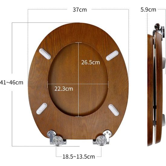 Takket være sin O-form passer WoodElegance-toiletsædet til næsten alle standardtoiletter. De justerbare hængsler giver fleksibilitet og muliggør nem installation med en justering af hængselafstanden på 13,5 til 18,5 cm. Garanteret perfekt pasform!
